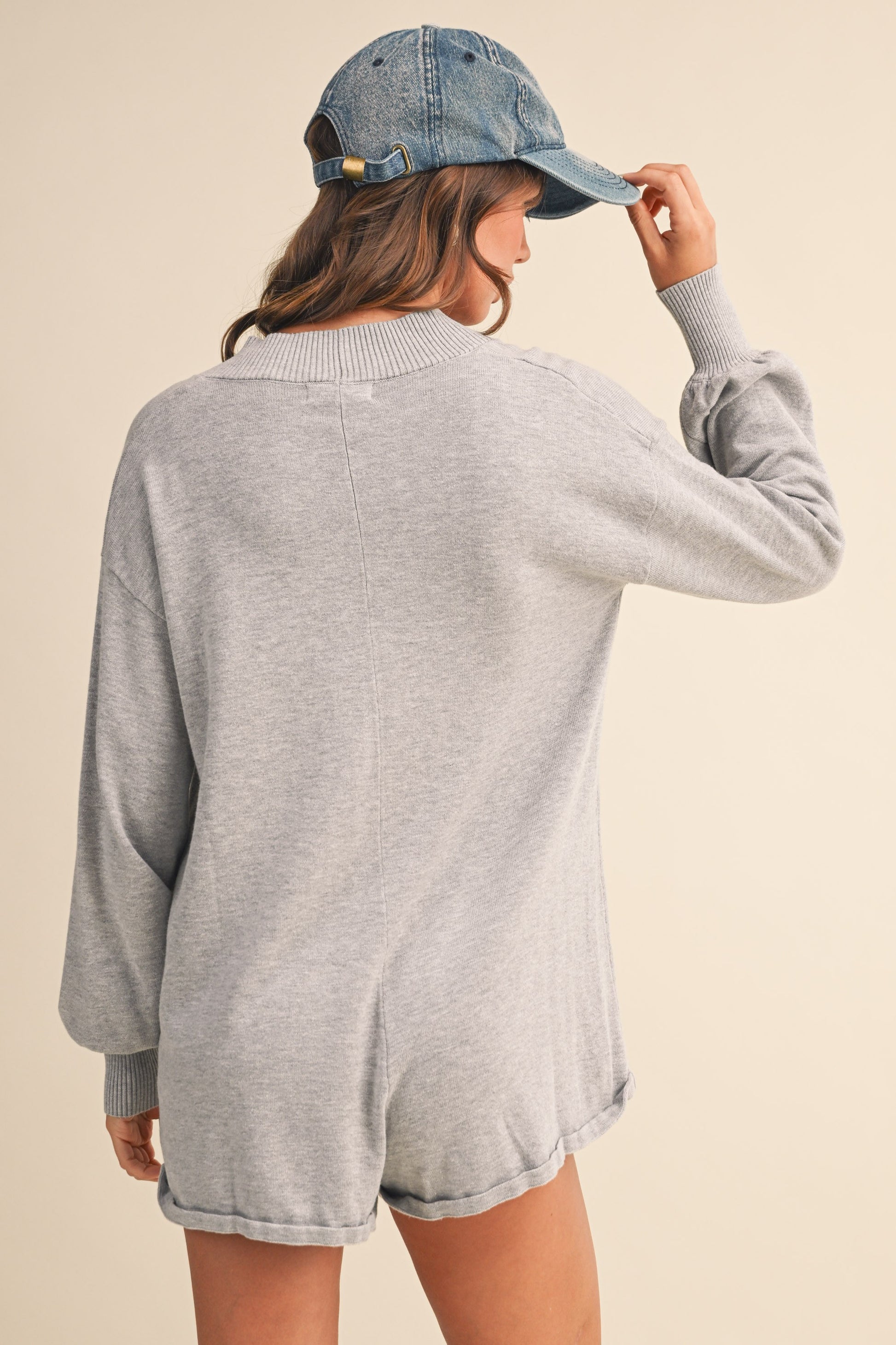 Laid-back and effortlessly cute — this cozy knit romper is your go-to for easy, off-duty style. Featuring a relaxed fit, deep V-neckline with button details, and soft balloon sleeves, it’s perfect for lounging at home or running weekend errands in comfort. Pair it with sneakers or a baseball cap for that perfectly undone, cool-girl vibe.