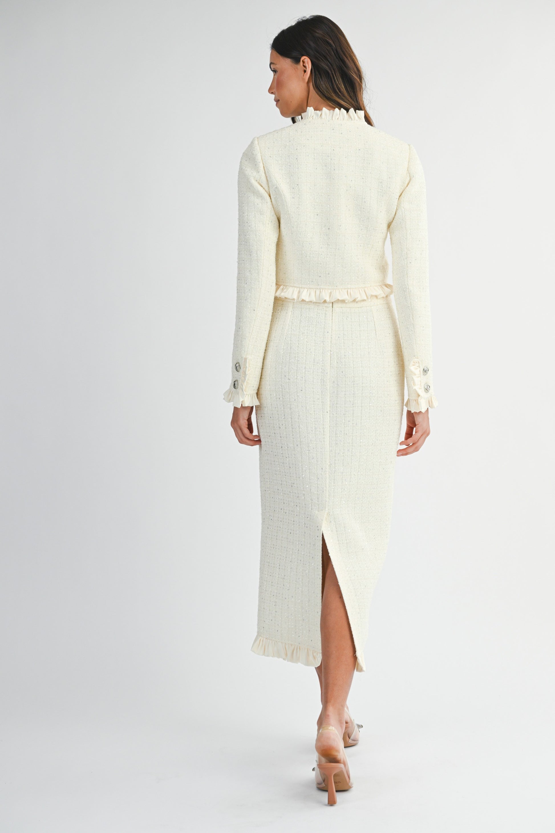 Refined and romantic, this tweed set is the epitome of classic femininity. Crafted from soft, textured tweed with delicate shimmer woven throughout, this two-piece set exudes understated elegance. The structured cropped jacket features ruffled trim, crystal button details, and tailored lines, while the matching midi skirt creates a long, clean silhouette with a soft ruffle hem for a graceful finish.