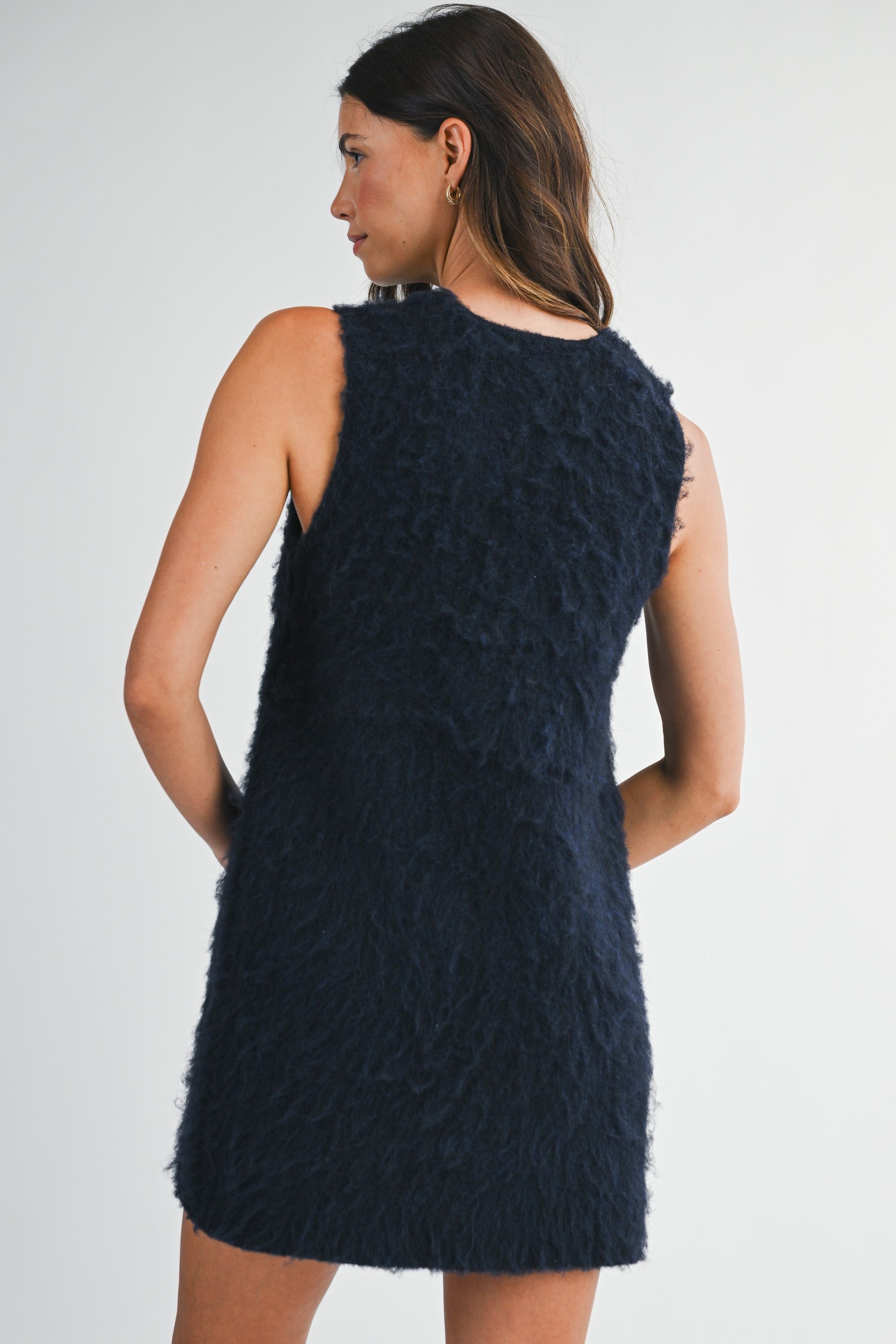Modern glamour meets playful sophistication with this mini dress. Crafted from a soft, plush textured fabric, this sleeveless shift silhouette offers a flattering, structured fit with just the right amount of movement. The standout detail? A row of sparkling, jewel-toned buttons that add a festive, elevated touch to the classic black mini.